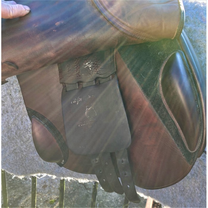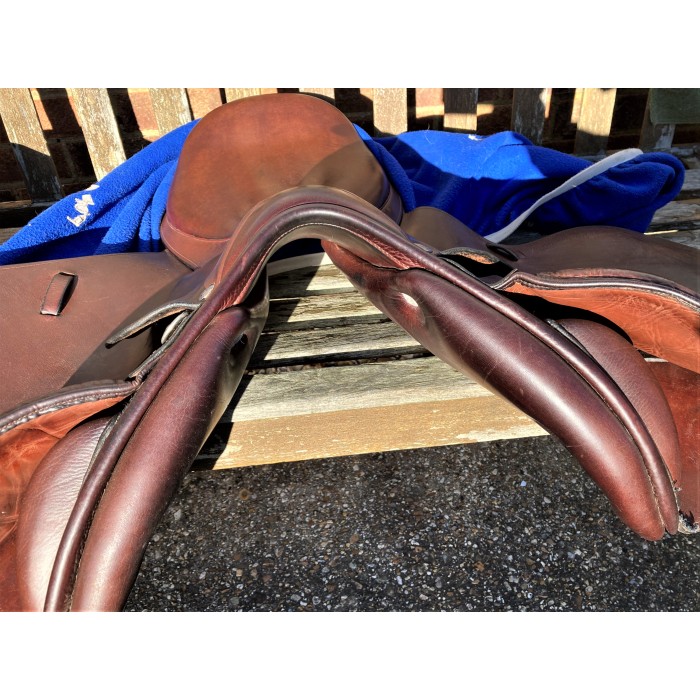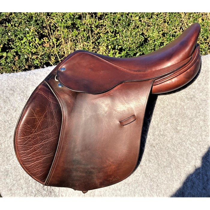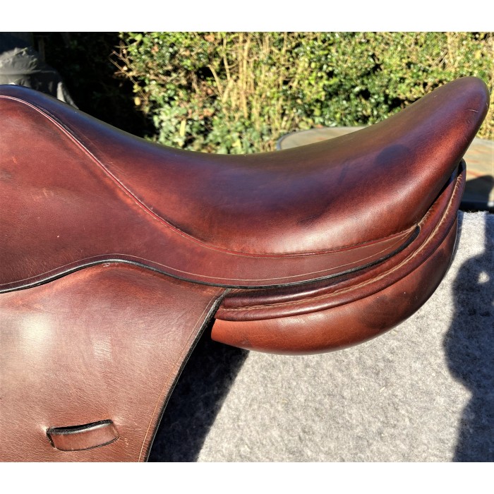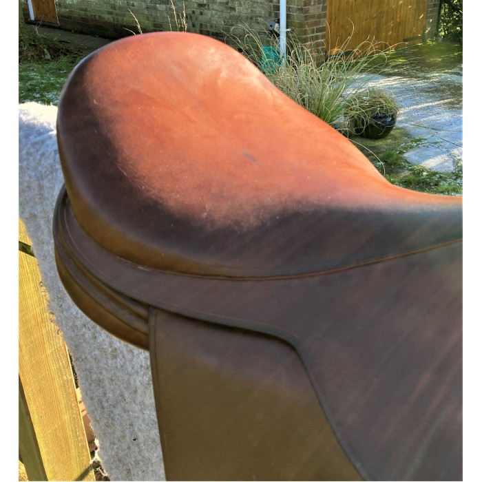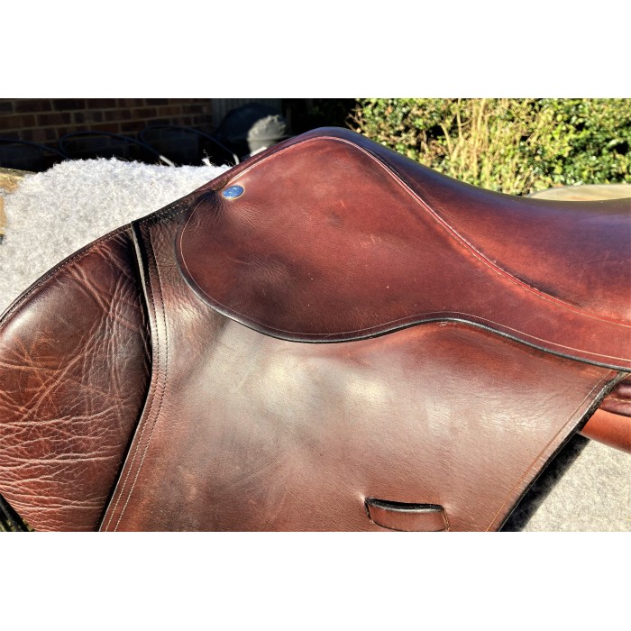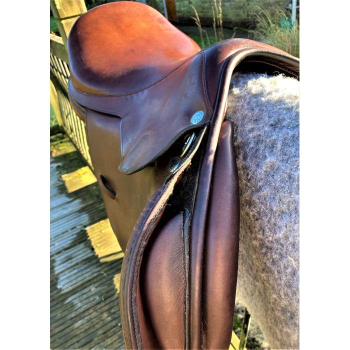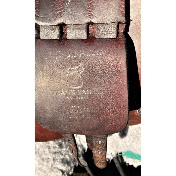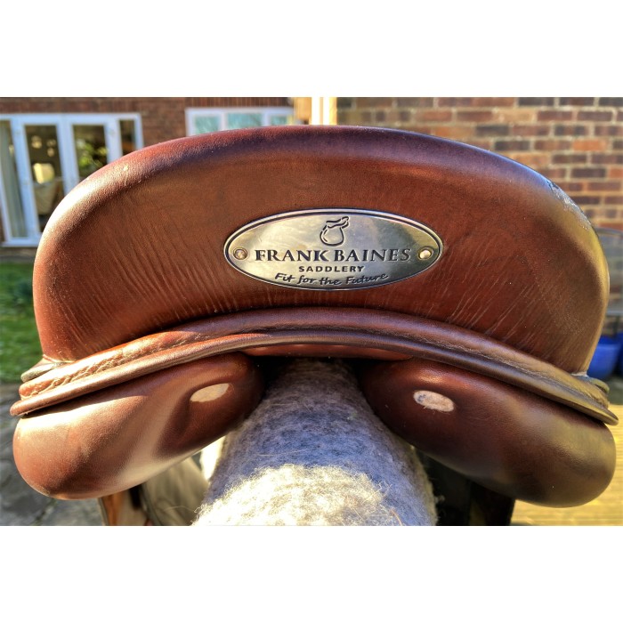 This is a second-hand Frank Baines Elan Close Contact Eventing / Jumping Saddle, 17.5" Nut Brown, Wide / Medium Wide with foam panels and a flap made 2cm straighter than the normal jump flap.